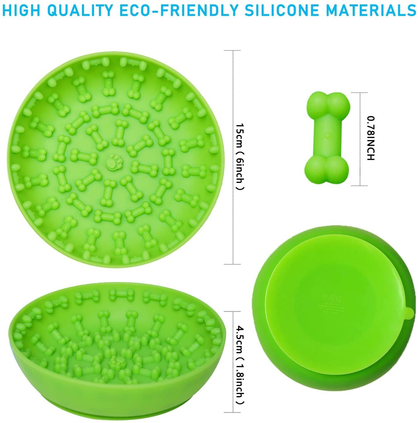 The lick bowl for dogs with bone shape inside will calm and relax your pet by distraction through the promotion of licking; Great for use during anxious and stressful situations, made from 100% food grade natural silicone, BPA free, no smell or taste, durable, strong flexibility, never deformed and food safe for you lovely pet.